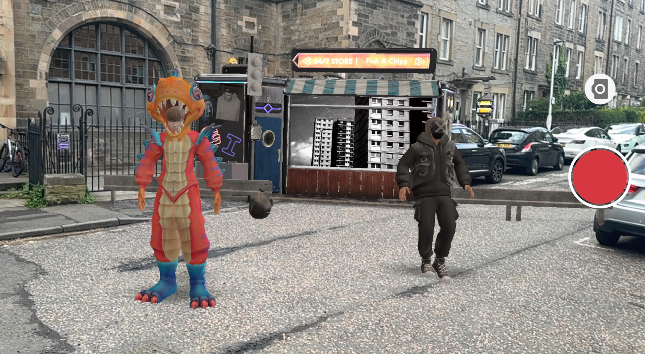 The rap became the audio spine of the project — a trace of the young men’s perspectives expressed through rhythm, tone, and tempo. Lyrics such as “same shit every day,” “trying not to carry a knife,” and “hoping I can change one day” shaped the spatial and temporal arc of the AR experience, which unfolds within a speculative “Neo-Glasgow” cityscape marked by local identity: an Irn-Bru street stall, a Steg G poster.